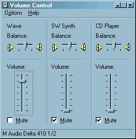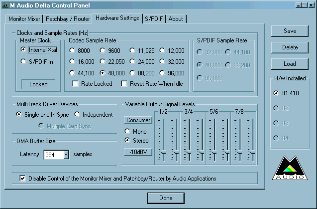 With the 366MHz machine, we could not achieve undistorted 24bit operation unless the "Rate Locked" button was Checked, and "96kHz" was selected as the Codec Sample Rate - but the card then seemed to be dropping samples in either 24bit mode or at sample rates above 48kHz, as evident by periodic breakup during spectral analysis of a steady tone. These issues are probably due to using a computer that has much less than the recommended clock speed for this card (testing was with a 366MHz Celeron machine). With this slow machine, the settings below were the best compromise (at 48kHz, and not using 24bit).