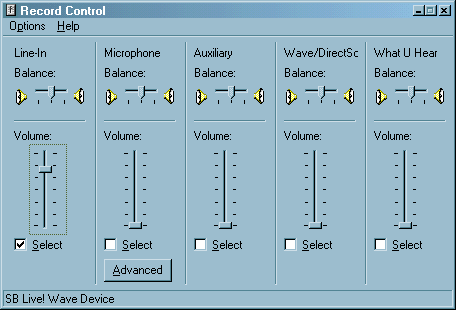 Mixer settings: controls not shown should be muted and/or set to minimum settings for playback, or be unselected and at minimum for record).