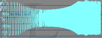 1) The soundcard's playback tone controls, accessible via the "Advanced" button under the "Play Control" slider in the Play Mixer, are horribly unbalanced. The actual "flat" setting is not in the middle, but is way to the left, as shown in the picture near the bottom of this page. It almost seems as if Creative Labs was trying to get us to boost the bass and treble to give the card a phony "HiFi" sound. {If you want to get an easy view of the flatness of these settings, you can use Praxis to show you a time domain plot of a Chirp at from the output-- the Chirp's overall shape -- its "envelope" should be flat over a 20 to 20kHz range} like this: