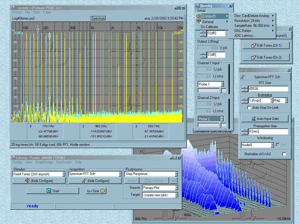 PRAXIS performs convenient, sophisticated, and high quality audio measurements of loudspeakers, electronics, vibrating systems and rooms. PRAXIS utilizes higher quality Windows based digital soundcard hardware for versatility, compatibility and portability. PRAXIS can be used free of charge (in its "free" mode)