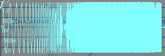 1) The soundcard's playback tone controls, accessible via the "Advanced" button under the "Play Control" slider in the Play Mixer, are horribly unbalanced. The actual "flat" setting is not in the middle, but is way to the left, as shown in the picture near the bottom of this page. It almost seems as if Creative Labs was trying to get us to boost the bass and treble to give the card a phony "HiFi" sound. {If you want to get an easy view of the flatness of these settings, you can use Praxis to show you a time domain plot of a Chirp at from the output-- the Chirp's overall shape -- its "envelope" should be flat over a 20 to 20kHz range} like this: