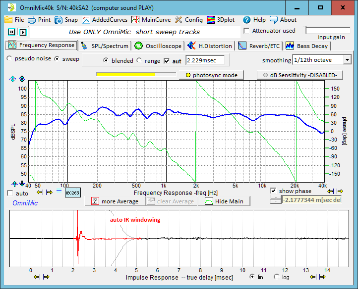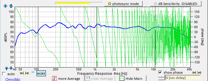This is important to keep in mind particularly when using Photosync with the Photolink device and OmniMic40k to include true distanc travel in the measurement. In that case, the impulse response will be shown at some distance to the right, depending on the "time of flight" or how long it took the sound to get from the loudspeaker to the Omnimic due to the finite speed of sound travel. The frequency response magnitude will not be affected, but its phase response will be strongly effected because time delay increases downward phase shift proportional to the frequency of each data point. That will usually make the phase graph too busy, with phase repeatedly crossing the +/-180 degree wrap-around limits*. So to make it more comprehensible you can compensate the phase response with a negative delay value in the control at the bottom right of the frequency response graph below the "show phase" checkbox.