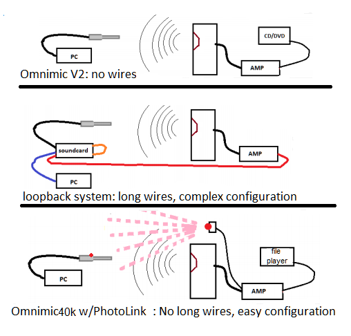Optical syncrhonization (or "photosync`") is similar to the wired "loopback" technique used with some measurements systems, except Photosync still allows for OmniMic's wireless advantage that lets you quickly and conveniently measure without stretching cables around the room. Optical synch requires an OmniMic40k type microphone and PhotoLink device.
