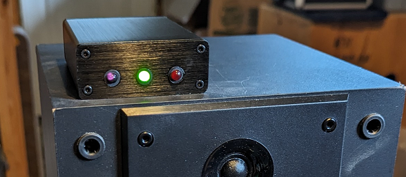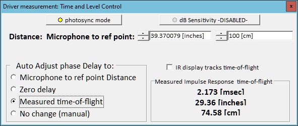 The first function is to transmit a timing Optical Syncrhonization signal via modulated infrared light to an OmniMic40k microphone. Note that "Photosync" refers to the technique of syncronizing timeing via a light signal, while "PhotoLink" refers to the device that is used to accomplish this. It is primarily intended for measuring drivers for speaker design with true phase delay included and to account for time-of-flight effects of sound through the air to the microphone. In multi-way loudspeakers, the way that various drivers interract is affected by their relative distances from the listener/microphone and the "starting point" of drivers varies with their construction. When making FRD frequency response data files with optical syncronization for crossover design, the included delay should be compensated per the measured distance of the microphone tip to the mounting baffle surface the drivers are on. Also, the measurements should be made in "dB sensitivity mode" to account for driver sensitivities (see below). This will keep driver measurements compatible with others done the same way to allow you to investigate different combinations with a crossover simulator.