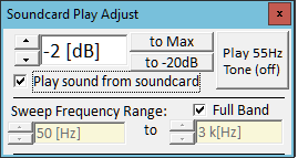 Further, only the OmniMic "short sweep" test signal (as used for frequency response measurements) should be used for setting the signal level with the PhotoLink. A continuous sine-wave or noise type signal cannot accurately be used for this. However, once levels are set using the Short Sweep signal, the same level will be correct if you change to one of the other test tabs such as Distortion, SPL, or Reverb. You can limit the Sweep Frequency Range after setting proper level with the "Soundcard Output Level" first set to "full band", and the levels over the specified range will be at the determined level.