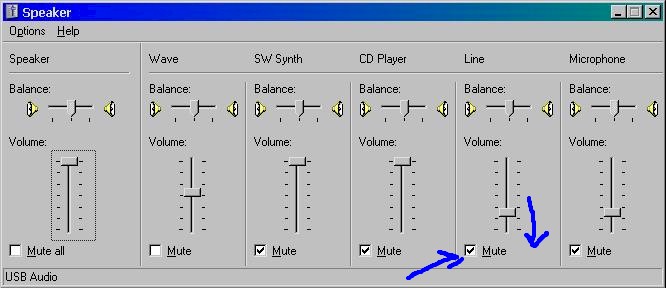 Bug note: there have been reports of the "Line" input to the "Speaker" (or Play) mixer in Windows becoming unmuted when PRAXIS reloads the soundcard mixer settings. If measurement problems are encountered, please check the Play mixer settings and make sure that the Line input is still muted. (it is a good idea to also set the Line input level to minimum in the Play mixer).
